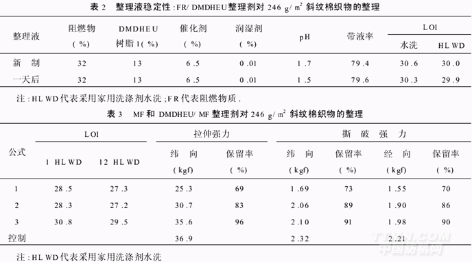 基于以上的研究,我們做了DMDHEU/MF交聯體系的研究,發現它結合了DMDHEU系統的耐久性和MF交聯系統的高阻燃性和低強力損失的優點。