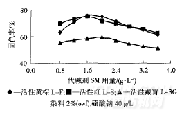 由圖1可知,開始時,隨著代堿劑SM用量的增加,3種活性染料的固色率都增加.活性黃棕L—F或活性紅L—S染色時代堿劑SM用量1.6g/L,活性藏青L一3G染色時代堿劑SM用量2.0g/L,固色率有最大值;隨著代堿劑用量的進(jìn)一步增加,固著率呈下降趨勢,原因是堿劑用量過少,染色時達(dá)不到活性染料反應(yīng)所需的pH值,染料不能充分固著;堿劑用量過大,染液pH值過高,固色率反而下降,活性染料在染浴中水解率也相應(yīng)增大,最終導(dǎo)致染色織物得色量降低.所以,在使用代堿劑SM時應(yīng)嚴(yán)格控制其用量.