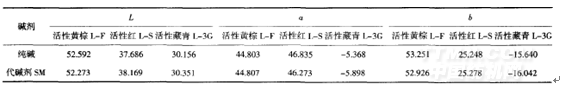 從表2可知,代堿劑SM 1.6g/L時固色的色光與純堿20g/L固色時相近,滿足活性染料的固色需要.經(jīng)目測比較,2種工藝染色試樣得色深度及色光基本一致.目前,包括純堿在內(nèi),無堿劑能適應(yīng)所有活性染料的固色.代堿劑替代純堿,二者終究不是同一種化學(xué)物質(zhì),發(fā)生的化學(xué)反應(yīng)相異,在固色后的色光也不同.所以,使用代堿劑固色時,在打樣過程中也應(yīng)使用代堿劑作為固色堿劑,這樣才能盡量避免色光的變化