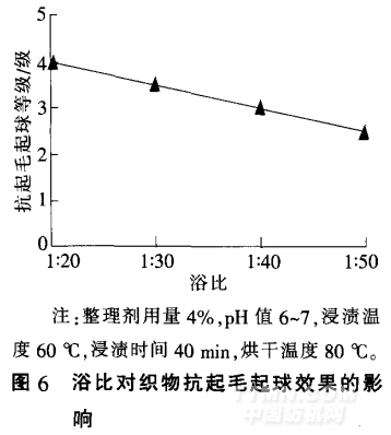 2.6浴比的影響 圖6為在相同工藝條件下.改 變浴比對織物抗起毛起球效果的影響。