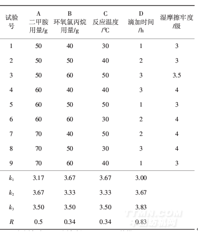 從表1可知,影響因素主次關系為D>A>B=C,取A2B1C1D3時,染色織物濕摩擦牢度最好,即固色劑最佳合成條件為:二甲胺60g,環氧氯丙烷40g,30℃,滴加3h.因為二甲胺與環氧氯丙烷縮聚反應為等物質的量反應,因此二甲胺60g、環氧氯丙烷40g的原料配比符合理論反應量.在堿性低溫條件下,二甲胺與環氧氯丙烷反應生成季銨物,而季銨物與環氧氯丙烷反應速率大于二甲胺與環氧氯丙烷反應速率,有利于縮合生成分子質量大的固色劑.固色劑分子質量越高,與纖維結合越牢,染色織物濕摩擦牢度越高.