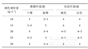 從表2可知,染色織物的色牢度隨著固色劑用量增加而增加,當固色劑用量達到25g/L時,色牢度達到最佳,可能原因是固色劑的陽離子基團與活性染料的磺酸基陰離子結合成離子鍵,形成不溶性大分子色淀,封閉了染料的水溶性基團,染料水溶性下降,提高色牢度.另外,固色劑的陽離子基團與活性染料的磺酸基陰離子反應生成氯化鈉電解質,能更好地促使陰離子染料吸附在纖維上,與陽離子固色劑形成色淀.