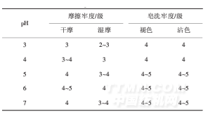 從表3可知,染色織物的色牢度隨著固色液pH增加而增加,當固色液pH達到6時,色牢度達到最佳,超過6時,色牢度反而降低.可能原因是pH較低時,過多的醋酸根使溶液中陽離子固色劑之間排斥力減小,部分陽離子固色劑締合成分子聚集體,只能與織物表面的染料陰離子結合,使色牢度降低.隨著固色液pH增大,陽離子固色劑之間排斥力增加,能滲入纖維內部,使色牢度增加.由于固色劑中羥基與纖維素中羥基在弱酸性時易形成醚鍵,故固色液pH=6時,牢度達到最佳.當固色液pH繼續增大,固色劑的陽離子性變弱,與陰離子染料結合力降低,染料溶落于溶液中,降低色牢度.當pH>6時,固色劑中的羥基形成鈉鹽而發色,則織物開始顯紅光.[8-9]