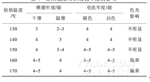 從表4可知,染色織物的色牢度隨著焙烘溫度升高而增加,當焙烘溫度達到160℃時,色牢度達到最佳,超過160℃時,織物開始泛黃.可能原因是隨著焙烘溫度升高,固色劑中羥基與纖維素中羥基反應程度提高,織物色牢度增加,160℃時,色牢度達到最佳.超過160℃時,則部分氨基氧化導致泛黃.