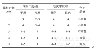 從表5可知,染色織物的色牢度隨著焙烘時間延長而增加,當焙烘時間達到3min時,色牢度達到最佳,超過3min時,織物開始泛黃.可能原因是隨著焙烘時間延長,固色劑中羥基與纖維素中羥基反應越充分,色牢度提高.當焙烘時間為3min時,該反應已完全.超過3min時,部分氨基氧化導致泛黃.