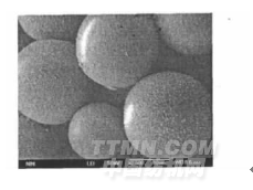 電鏡照片中,復合微球呈圓球形,粒徑均勻,表面光滑,平均粒徑在20μm左右。