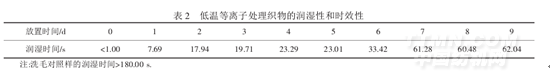 蛋白酶處理前進(jìn)行預(yù)處理,使羊毛鱗片外角質(zhì)層中的二硫鍵打開(kāi),提高羊毛的親水性,使蛋白酶容易接近蛋白質(zhì)分子鏈,發(fā)生吸附和催化反應(yīng).[8]傳統(tǒng)采用H2O2預(yù)處理與蛋白酶結(jié)合.本文采用低溫等離子作為蛋白酶的預(yù)處理,分析低溫等離子-蛋白酶聯(lián)合改性對(duì)羊毛性能的影響,結(jié)果如表3 所示.