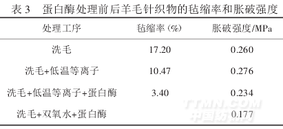 為進(jìn)一步降低蛋白酶對(duì)羊毛的損傷,將低溫等離子+蛋白酶+TG 酶聯(lián)合對(duì)羊毛進(jìn)行改性,分析改性后羊毛的氈縮性和脹破強(qiáng)度.結(jié)果如表6 所示.