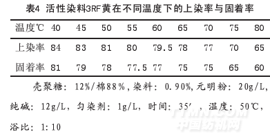 從表4可以看出,殼聚糖對溫度比較敏感,更適合于中低溫染色。一般情況下,溫度的升高有利于染料的擴散,染料與纖維之間的反應性增加,溫度升高還會加劇染料的水解,固著率降低;同時在堿性條件下,活性染料與殼聚糖纖維的-NH2形成共價鍵結合,還會與殼聚糖纖維上的羥基形成共價鍵結合,提高溫度有利于勻染。故我們一般在60℃染色,降到50℃后固色。