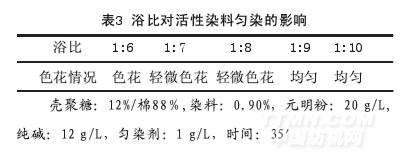 隨著國家節能減排要求的進一步提高,我們在染色時盡量把浴比放到最低,同時由于染色設備和產品的特殊性,毛巾的最低浴比我們一般在1:6~1:8之間;但是從表3我們可以看出,浴比只有放到在1:9~1:10之間才能保證殼聚糖毛巾不色花,為了保險起見我們使用浴比1:10。由于殼聚糖分子中帶有陽離子性,對染料有很強的直接性是棉的幾倍,這個不難理解浴比越小,對染色就越不利。