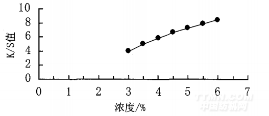 配制不同濃度百分率的商品染料,測試其轉移印花后的表觀色深K/S值,結果見圖8。烘焙時間均為60s,溫度為200~C,增稠劑為水基型增稠劑,使用染料為商品分散紅3B