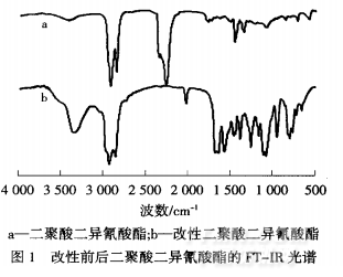 由圖1可知,a吸收曲線上2930cm-1處為甲基的C-H伸縮振動吸收峰,2920cm-1處為六元環(huán)烷烴,2270cm-1處強吸收譜帶為異氰酸酯的N=C=O.b吸收曲線上異氰酸酯基的特征峰已經(jīng)完全消失,說明反應過程中氨基、硅烷已經(jīng)化學鍵合N-聚酸二異氰酸酯分子結(jié)構(gòu)中.2930cm-1處為甲基的C-H伸縮振動吸收峰,2920cm-1處為六元環(huán)烷烴,3350cm-1、1640cm-1應為酰脲NH—CO—NH—),1080cm-1處為Si-0-C吸收峰.