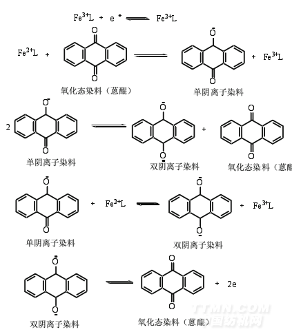 在可逆的電化學工藝中,第一步還原反應是Fe3+絡合物在陰極表面獲得一個電子,被還原成Fe2+絡合物;被還原的Fe2+絡合物從陰極擴散到染料粒子表面,在粒子表面發生電荷轉移(包括單電子轉移),形成單陰離子染料,這是形成被完全還原的雙陰離子染料的中間步驟。有二種途徑可形成被完全還原的雙陰離子染料。對大多數染料來說,每還原一個染料需要二個電子,二個單陰離子染料可生成一個完全被還原的雙陰離子染料,并重新生成一分子氧化態染料。形成雙陰離子染料分子的另一個反應機理可能是:首先發生單電子轉移,形成單陰離子染料分子,然后單陰離子染料被還原形成雙陰離子染料分子。