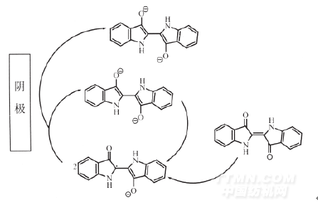 Albert Roessler直接采用靛藍作為電子載體進行靛藍染料的電化學還原。染色開始時,先采用少量的保險粉對部分染料進行還原,生成染料隱色體,然后在電化學的作用下,懸浮在溶液中的染料顆粒與染料隱色體作用,生成一種介于染料本身和染料隱色體之間的離子自由基。離子自由基的還原相對容易,反應產物在實驗條件下比較穩定。在離子自由基的作用下,電化學還原過程自發進行,整個反應過程如下: