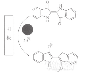 在該方法中,染料不是在電極表面被直接還原,而是采用一種媒介作為電子載體,使氧化還原反應分別發生在陰極表面和染料顆粒表面,因此被稱作間接電化學染色。反應過程如下: