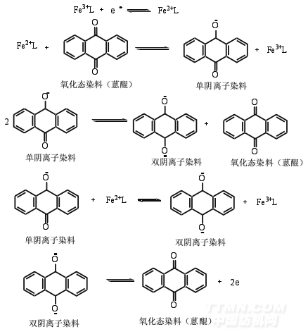 有機氧化還原體系主要是一些具有蒽醌型結(jié)構(gòu)的有機化合物。Bechtold等人選用蒽醌單磺酸、蒽醌雙磺酸、羥基蒽醌及其各種取代物作為間接電化學(xué)染色媒介,用于硫化和還原染料的還原。試驗發(fā)現(xiàn),采用蒽醌作為間接電化學(xué)染色媒介其陰極峰電位高達-850 mV(Ag/AgCl/3M KCl)。可以還原絕大部分染料。有機氧化還原體系的一個缺點是,其在電