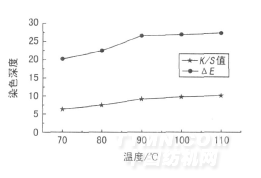 由圖2可以看出,隨著染色溫度的升高,K/S值和色差ΔE都逐漸增大,兩者變化趨勢一致。溫度越高,染料越容易上染真絲,K/S值和ΔE在80~90℃時變化較大;當溫度超過90℃,K/S值和ΔE趨向于穩定。