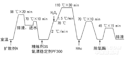 藥品 精練劑3S,除氧酶,片堿,擴散劑N,過氧化氫,勻染劑RCO,柔軟劑,液體蠟(市售);活性黃H-E4R,活性紅H-E3B,活性藍H-ERD(永光化學);氧漂穩定劑PF300,皂洗劑AST,固色劑EVL(上海佳和);氯化鈉,純堿,醋酸(99. 8%,工業級)。