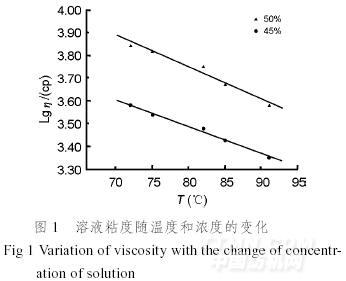 由圖1~2可知,本實(shí)驗(yàn)所配制的紡絲溶液,其粘度隨濃度的增加而增加,隨溫度和表面活性劑加入量的增加而降低。這是因?yàn)殡S著溶液濃度的增加,蛋白質(zhì)大分子間的作用力和瞬間網(wǎng)絡(luò)結(jié)構(gòu)增加,使得溶液粘度增加。當(dāng)溫度上升或表面活性劑用量增加時(shí),大分子鏈段的活動(dòng)能力變大,分子間力減弱,瞬間網(wǎng)絡(luò)結(jié)構(gòu)被破壞而導(dǎo)致粘度下降。而且隨著溶液濃度的提高,其粘流活化能增大,粘度受溫度的影響也就越顯著。表明該溶液符合一般高聚物溶液的基本特性和Arrhenius方程式η=A·expEη/RT所表征的規(guī)律。式中A為由聚合物種類(lèi)、分子量、鏈剛性決定的常數(shù),Eη為粘流活化能,T為絕對(duì)溫度,R為氣體常數(shù)[7]。