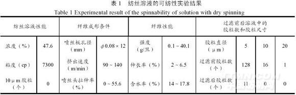 紡絲溶液的可紡性是指紡絲流體在單軸拉應力狀態下能大幅度地出現不可逆伸長形變的能力,即紡絲流體在拉伸作用下形成連續細長絲條的能力。這一能力不僅與紡絲溶液的粘性、流動性相關,而且與溶液的溶解度即溶液中的膠粒個數及膠粒尺寸相關[7]。當溶液固含量為47.6%,1#助劑濃度為0.06%,2#助劑濃度為0.2%,溶脹溫度為40℃,溶脹時間為2h,溶解溫度為75℃,溶解時間為1.5 h時,溶液的膠粒數、膠粒尺寸和紡絲溶液的可紡性實驗數據如下表所示。