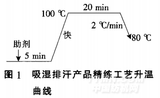 吸濕排汗整理劑QC一1476屬于非離子水分散性聚酯.其主要組分的結(jié)構(gòu)與聚酯纖維完全相同 用這樣結(jié)構(gòu)的整理劑整理織物時.其與聚酯分子結(jié)構(gòu)相同的部分能夠發(fā)生融合.進入聚酯纖維的結(jié)晶區(qū)形成共熔結(jié)晶.從而可使織物獲得耐久的整理效果.升溫曲線如圖3所示