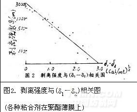 δ1和為δ2為兩種粘合高聚物的溶解度參數,(δ1-δ2)可表示兩種高聚物的相容性,兩種物質的溶解度參數越接近,則相容性越好。在P和q為常數的前提下,粘合強度隨相容性的增加而增加。如用log剝離強度對(δ1-δ2)作圖可得一直線。
