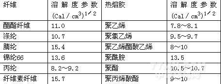 為了得到較高的剝離強度,在選用粘合襯布時,應考慮到熱熔膠與纖維的相容性,選用溶解度參數相近的。特別是化纖長絲織物相容性對粘合強度的影響尤為明顯,如滌綸長絲織物的面料必須用聚酯熱熔膠,而尼龍長絲的織物必須用聚酰胺熱熔膠。現將常用纖維和熱熔膠的溶解度參數列表如表3。