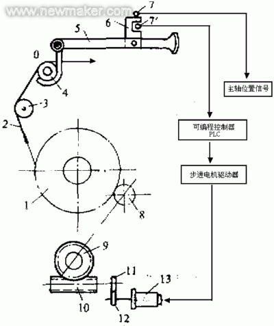 本裝置是通過檢測后梁的擺動是否超出范圍來檢測經紗張力的波動是否滿足要求,不滿足要求時就控制送經裝置予以調整。如圖4,當經紗2的張力發生波動時,活動后梁4帶動張力感應桿5繞點O擺動。當檢測片6進入接近開關7的有效作用區時,接近開關7就發出一高電平信號。以PLC為核心的控制器根據這一信號和主軸位置信號,啟動步進電機13,驅動織軸送出經紗。接近開關7’是極限張力檢測開關。當經紗張力過大或過小時,檢測片6將遮擋接近開關7’,7’輸出的高電平信號到控制器后,控制器就會關掉織機,以便進行人工處理。主軸位置的檢測是為了控制送經運動的允許時間,以避開打緯,保證緯紗能被打緊。主軸位置的檢測同樣采用的是接近開關非接觸式檢測。