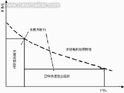 對于織機送經機構,其負載特點是:當步進電機正轉送出經紗時,經紗張力不是負載阻力,而是驅動力。因此步進電機只需輸出較小力矩,克服蝸桿蝸輪自鎖性,織軸即可回轉經。此時步進電機轉速可能較高(由緯密定);當步進電機反轉張緊經紗時,經紗張力是負載阻力,步進電機需輸出較大的驅動轉矩,而此時步進電機轉速要求較低,步進電機的輸出矩頻特性(如圖5虛線所示)正好與其相適應。因此、步進電機非常適合于這類伺服機構低轉速大轉矩、高轉速小轉矩和高精度的要求,是織機送經機構理想的驅動元件。