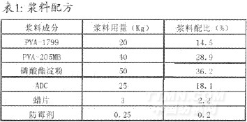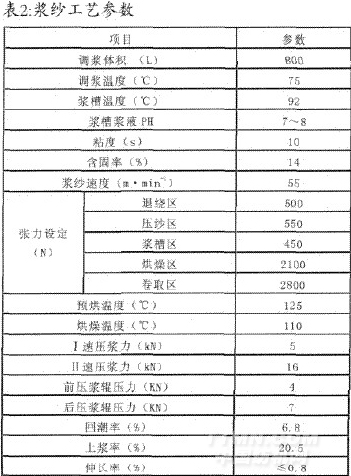 由于本產品為純棉細特高密織物,總經根數多、經紗密度大,漿紗采用24只經軸進行并合,織軸幅寬277.5cm,上漿困難,加之紗線較細,強力較低,織造難度系數也大。如果上漿率偏小,或者上漿不勻,則不能很好的伏貼毛羽,容易造成斷經,再加上高速噴氣織機開口又小,如果開口不清,極易造成阻緯,導致產生疵布。因此,此品種上漿時既要有較好的浸透以適當增強,又要有良好的被覆以貼伏毛羽,并形成柔韌光滑的漿膜以增加耐磨,以保證開口清晰,適應噴氣織機高速、大張力的織造要求。本著既能達到上漿質量、滿足織造及成品要求,又盡量少用PVA、減少環境污染,同時兼顧漿紗成本的原則。采用的漿料配方如表1所示: