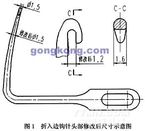 1.1.2.4 對(duì)鉤針頭部進(jìn)行了如圖1所示的處理,鉤針的根部尺寸不變,以保持一定的強(qiáng)度,而緯紗會(huì)卷繞到的過渡段從φ2mm改進(jìn)為φ1.5mm,此時(shí)以緯紗的中心計(jì)算,繞一圈的周長為L=πD=3.14×2.5=7.85mm,從理論上保證了緯紗不會(huì)滑出壓腳;另外,對(duì)鉤針頭部適當(dāng)增大尺寸后,將溝槽增大至1.2mm,并進(jìn)行適當(dāng)?shù)膱A整。再經(jīng)過我們的仔細(xì)觀察和細(xì)心調(diào)節(jié),使折入邊裝置的鉤針、剪刀壓腳和鋼筘、織機(jī)開口等配合完美,最后織物光邊的折入穩(wěn)定性和織物邊平直度達(dá)到了理想要求。