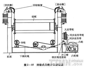 凸輪開(kāi)口按綜框驅(qū)動(dòng)機(jī)構(gòu)的性質(zhì)可分為消極式和積極式兩種。消極式凸輪開(kāi)口機(jī)構(gòu)由開(kāi)口凸輪箱、鋼絲繩及導(dǎo)輪、回綜箱三部分組成。它由回綜箱中的回綜彈簧控制綜框復(fù)位。積極式開(kāi)口凸輪機(jī)構(gòu)用共軛凸輪驅(qū)動(dòng)綜框升降,不需要回綜裝置。歐洲噴氣織機(jī)多配置積極式凸輪開(kāi)口機(jī)構(gòu),最多8頁(yè)綜框。日本機(jī)型多配消極式凸輪開(kāi)口。