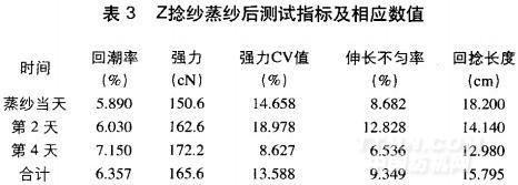 具體工藝優(yōu)選試驗(yàn)如下:蒸紗工藝參數(shù):抽真空8min,達(dá)到指定真空度0.08MPa,溫度95~110℃,高溫高壓蒸紗J20min,蒸紗后取紗樣測(cè)試數(shù)據(jù)見表2和表3。