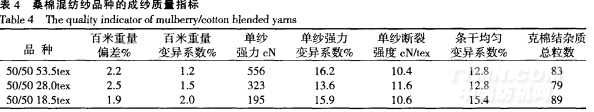 控制好紡紗張力,減少紡紗斷頭產生。采用硬度適中的中彈性膠輥,后區牽伸倍數控制在適當區域(根據實際情況制定),以減小牽伸波,降低粗細節數量。減小細紗機總牽伸倍數,有助于改善紗條光潔度和提高條干水平。經各道工序采取針對性的工藝措施,可順利紡制出桑棉混紡紗,成紗質量滿足織造用紗質量要求。