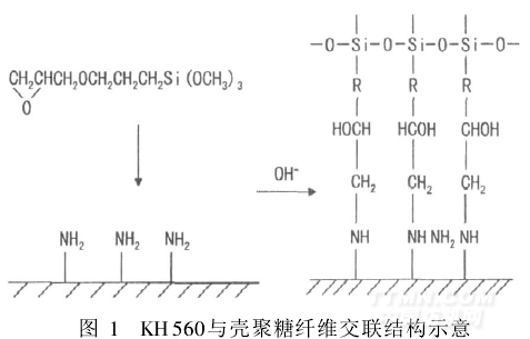 有機硅溶膠容易進行各種物理和化學改性,如加入某些添加劑,使添加劑均勻地包覆到三維有機硅金屬氧化物的網絡結構中,不同的添加劑,可獲得不同性能的納米溶膠膜[8]。本試驗旨在探索用溶膠-凝膠硅偶聯劑交聯法制備3-縮水甘油氧丙基三甲氧基硅烷(KH560)改性的納米SiO2,再用于殼聚糖纖維改性,并對該纖維染色性能進行研究,以供實際生產參考。