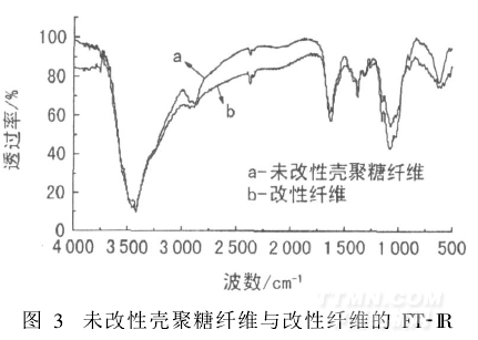 采用傅里葉紅外光譜,分析以3-縮水甘油氧丙基三甲氧基硅烷(KH560)作交聯(lián)劑制備的納米SiO2改性殼聚糖纖維中的殼聚糖纖維與KH560是否發(fā)生反應(yīng),結(jié)果見圖3。