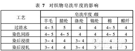 采用染色同浴法,吸濕排汗劑TF-620對織物的皂洗牢度影響較小;采用染后浸漬或染后浸軋法,TF-620對織物的皂洗牢度略有影響(表7)。
