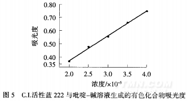 從圖5可知,C.I.活性藍222染料中均三嗪基上的活潑氯與吡啶一堿溶液反應生成的有色化合物,其吸光度與染料濃度(鹵代雜環上的活潑氯濃度)有很好的線性關系(相關系數尺:0.9972),因此可以對某些活性染料的水解過程進行定量分析.