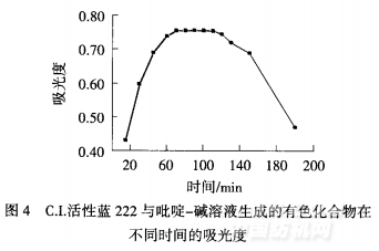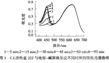 比色法中生成相對穩定的有色化合物需要一定條件,且活性基不同,反應條件有所變化.[1]554對C.I.活性藍222與吡啶一堿溶液在50℃下反應不同時間后
