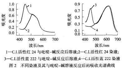 對一氯均三嗪活性染料(C.I.活性紅24)[3]和異雙活性基活性染料(c_I.活性藍222)與吡啶一堿溶液在50℃反應1h后溶液的吸收光譜曲線與染液本身的吸收光譜曲線進行對比.從圖2可知,鹵代雜環活性基上有活潑氯的一氯均三嗪活性染料(c.I.活性紅2和異雙活性基活性染料(c.I.活性藍222)與吡啶一堿溶液發生了反應,生成一種吸收波長約450nm的有色化合物,且c.I.活性紅24與吡啶一堿溶液反應生成的有色化合物的吸收強度很大,甚至超過了染料本身在510nm左右的吸收強度.分析認為,C.I.活性紅24除了均三嗪基上有活潑氯,染料結構中的苯環上還有一個活潑氯,這2個活潑氯均與吡啶一堿溶液發生反應生成有色化合物[-]553而C.I.活性藍222只有均三嗪基上的一個活潑氯與吡啶一堿溶液發生反應生成有色化合物.對于鹵代雜環潘l生基中活潑氯與吡啶一堿溶液反應生成有色化合物的具體結構,目前未有文獻涉及.