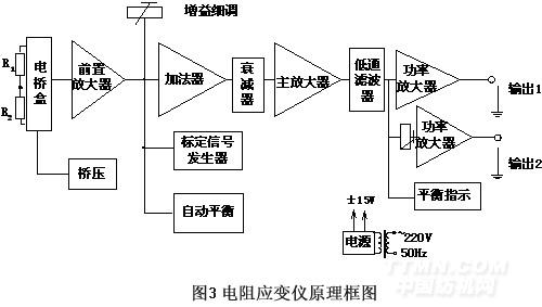 YD-28A型動態電阻應變儀的工作原理框圖如圖3所示,電壓輸出端1與帶USB接口的數據采集儀的輸入端相聯。其主要功能就是對采集的信號進行放大、濾波 [3] 。