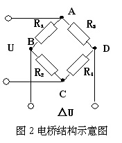 電橋按 120Ω設計,在電橋盒內有兩個120Ω精密無感線繞電阻作為半橋測量時的內半橋, 外半橋采用兩片等阻值的工作電阻應變計 ,結構如圖 2所示。U為供橋電壓;△U為輸出電壓;R 1 和R 2 為測量時外接應變電阻計;R 3 和R 4 為內橋電阻。 檢測頭為一受力傳感器,采用一端固定梁式結構,梁的正反面中央各貼一片工作電阻應變計。 電阻應變計由極細的金屬電阻絲用粘貼劑牢固地貼在試件上,或用金屬箔片印刷在試件上 [3] 。