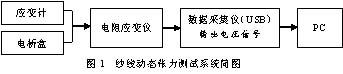 經編機正常編織時,紗線張力有兩個部分組成,一是平均 張 力,它與送經機構以及編織的工藝要求有關,傳統的張力儀器能夠測量其大小;另一分量是波動部分,它與成圈機件的相互運動、彈性、張力桿片簧的彈性模量及紗線的流變等因素有關,故很難用理論分析與計算的方法求出紗線的張力波動 [2] 。隨著計算機數據采集技術的應用飛速發展,數字化測試技術也日趨成熟,為經紗的動態張力測試提供了可能。文章介紹一種 用計算機數據采集技術對經編紗線動態張力進行數字化測試的方法,通過實驗測試槽針經編機在一個成圈過程中經紗的動態張力和不 同送經量下經紗動態張力的變化情況,分析了經紗張力與槽針經編機的成圈機件、張力補償裝置之間的關系。