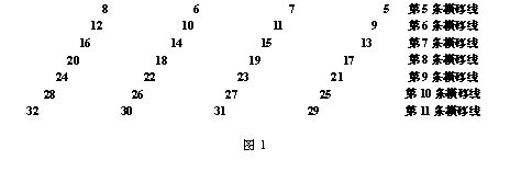 在花型小樣上確定花型的高度、寬度和使用的梳櫛梳櫛數(shù),并進行梳櫛分配。不同的梳櫛橫移線使用不同的顏色表示。每一條橫移線的導紗梳櫛一般分配在花紋循環(huán)的整個寬度,花梳呈交錯配置,例如MRES33花梳分配如圖1所示。這樣可以避免與另外一個導紗針相撞。另外,花型設計人員應該了解不同多梳機器的技術可能性。例如: