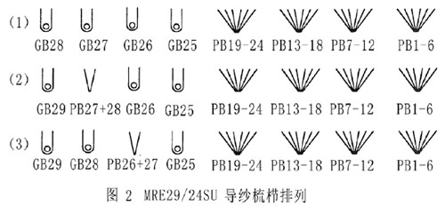 如圖1所示,MRE29/24 多梳經編機共有29把梳櫛,其中地梳前面放置了24把梳櫛,這24把梳櫛既作針背墊紗又作針前墊紗。2把梳櫛配置在24把花梳之后,用于生產特殊的地組織。然后再是兩把集聚成一條橫移線的用于形成花色底布的GB27、GB28。最后一把是彈性梳櫛。前6條橫移線可以成圈編織,所有梳櫛都由機器右側的SU電子橫移機構控制。梳櫛只作橫移,不作擺動。MRE29/24采用復合針、沉降片、脫圈板等。成圈機件由在封閉油箱內的凸輪機構傳動。