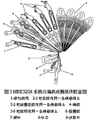如圖3所示,MRE32/24 多梳經編機共有32把梳櫛,其中地梳前面放置了24把梳櫛,這24把梳櫛既作針背墊紗又作針前墊紗。3把梳櫛配置在24把花梳之后,用于生產特殊的地組織。然后再是兩把集聚的兩條橫移線的用于形成花色底布的GB28、GB29,GB30和GB31。最后一把是彈性梳櫛。前6條橫移線可以成圈編織,所有梳櫛都由機器右側的SU 電子橫移機構控制。梳櫛只作橫移,不作擺動。同樣MRE32/24采用復合針、沉降片、脫圈板等。成圈機件由在封閉油箱內的凸輪機構傳動。