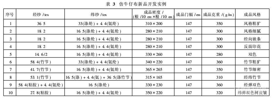 用粘膠紗。減少織造車間的飛花,是保證仿牛仔布成品漂白色質量的基礎。在加工過程中,雙氧水和泡化堿(水玻璃)濃度適當,對漂白色彈力仿牛仔布的影響不大。雙色彈力仿牛仔布,對經紗條干均勻度要求很高。接頭過多或條干不勻,都會嚴重影響布面質量。在織物經向嵌條或反面印花,都是增加花色品種的有效途徑。綜合以上因素,表2中的多個產品可拓展出更多