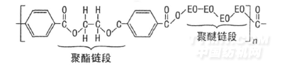 聚酯纖維具有高強度、洗可穿等優良性能,且價格便宜,廣泛用于服裝、裝飾及產業用紡織品。然而,其親水性很差,在服用過程中易產生靜電并沾污,影響服用舒適性。為此,人們在改善聚酯纖維織物親水性能方面做了大量研究。目前常用的聚酯纖維親水整理方法主要有共混聚合法[1],等離子體改性法[2],接枝聚合法[3],樹脂并用法[4]和聚酯聚醚類整理劑整理法[5, 6]等。采用共混聚合、接枝聚合和樹脂并用等方法,雖然能獲得一定的耐久性,但對織物手感及原有風格影響較大,且親水性達不到預期效果。聚酯聚醚嵌段共聚型親水整理劑分子中含有聚醚軟鏈段和聚酯硬鏈段,其化學結構式如下: