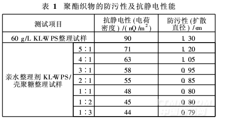 聚酯織物經殼聚糖與親水整理劑KL-WPS的復配液整理后,測試防污性和抗靜電性,結果見表1。