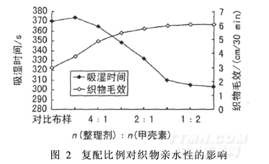 將2. 7%殼聚糖溶液與60 g/L親水整理劑KWPS溶液按比例進行復配,測試整理后聚酯織物的吸濕性和導濕性,并與僅用親水整理劑KL-WPS整理的試樣進行比較,見圖2。未整理聚酯織物的毛效為1. 0 cm/30 min。